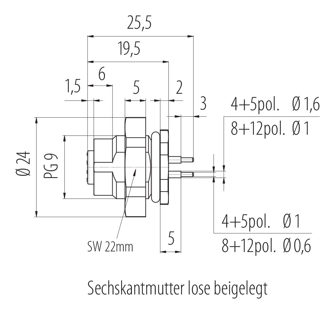M12 Flanschdose, Polzahl: 4, ungeschirmt, THT, IP67, UL 2238, PG 9, Rückwandmontage