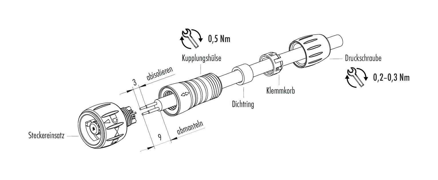 - Zum Schutz gegen unbeabsichtigtes Öffnen des Steckverbinders, ist bei einem Einsatz in Stromkreisen mit berührungsgefährlichen Spannungen das Gewinde zwischen dem Gehäuse und dem Steckverbinderkopf mit einem geeigneten Cyanacrylatkleber zu sichern. Dies gilt nicht für Steckverbinder, die in SELV und PELV Stromkreisen nach IEC 61140 (EN 61140, VDE 0140-1) eingesetzt werden.