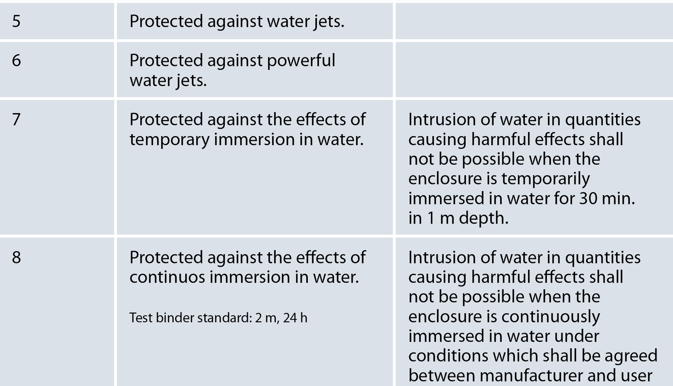 For example, a connector rated IP67 is completely dust-tight and protected against temporary immersion in water. It is important to mention that, as a common rule, the stated IP protection rating for connectors only applies when they are mated and locked. Within the binder portfolio, there are a few exceptions to this rule listed in the FAQ section at the bottom of this page.