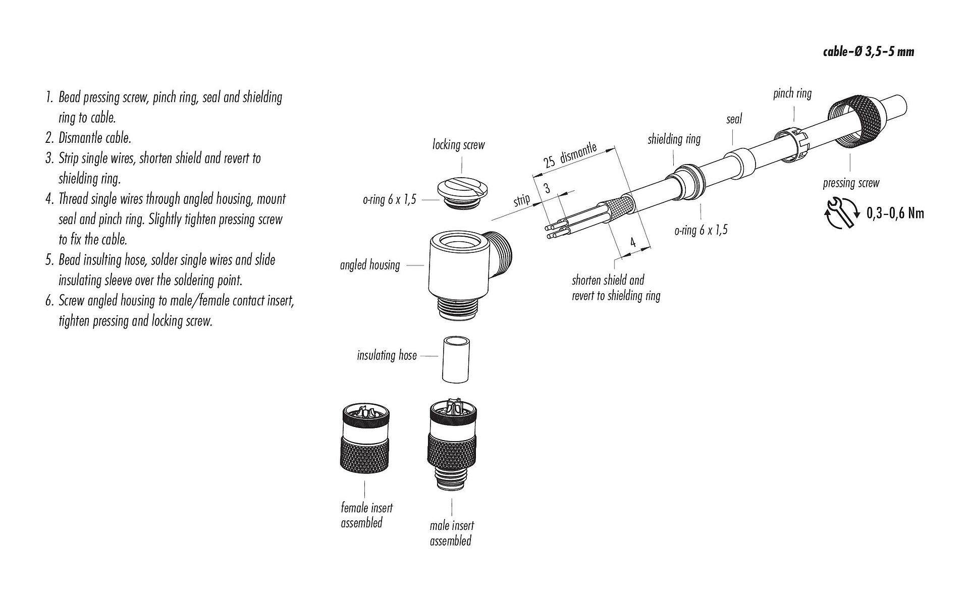 - Para proteger contra la apertura involuntaria del conector, la rosca entre la carcasa y la cabeza del conector debe asegurarse con un adhesivo de cianoacrilato adecuado cuando se use en circuitos con voltajes peligrosos al tacto. Esto no se aplica a los conectores utilizados en circuitos SELV y PELV según IEC 61140 (EN 61140, VDE 0140-1).