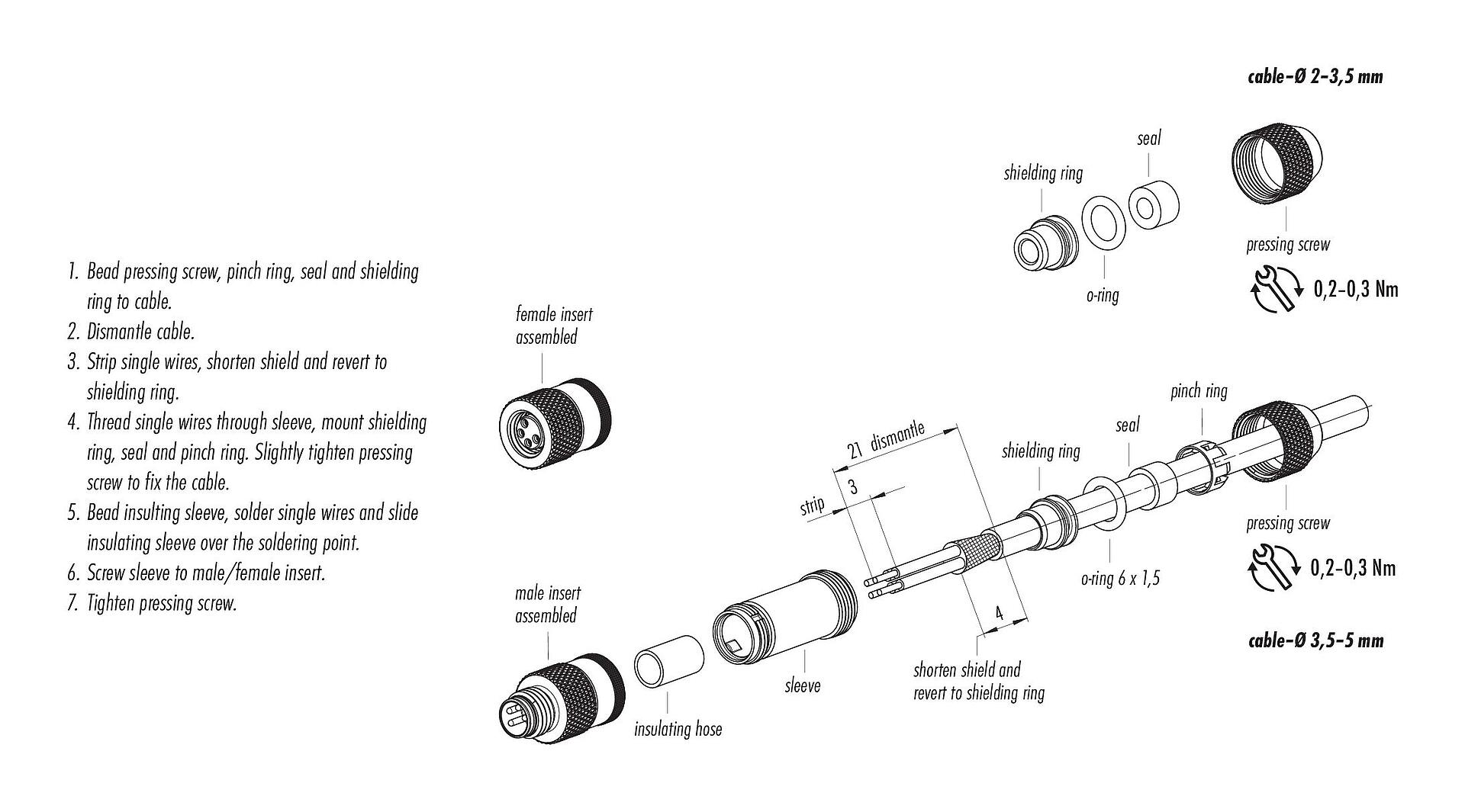 3. Ter bescherming tegen onbedoeld openen van de connector, moet de schroefdraad tussen de behuizing en de connectorkop met een geschikte cyanoacrylaatlijm worden beveiligd bij gebruik in circuits met aanraakgevaarlijke spanningen. Dit geldt niet voor connectoren die worden gebruikt in SELV- en PELV-circuits volgens IEC 61140 (EN 61140, VDE 0140-1).
