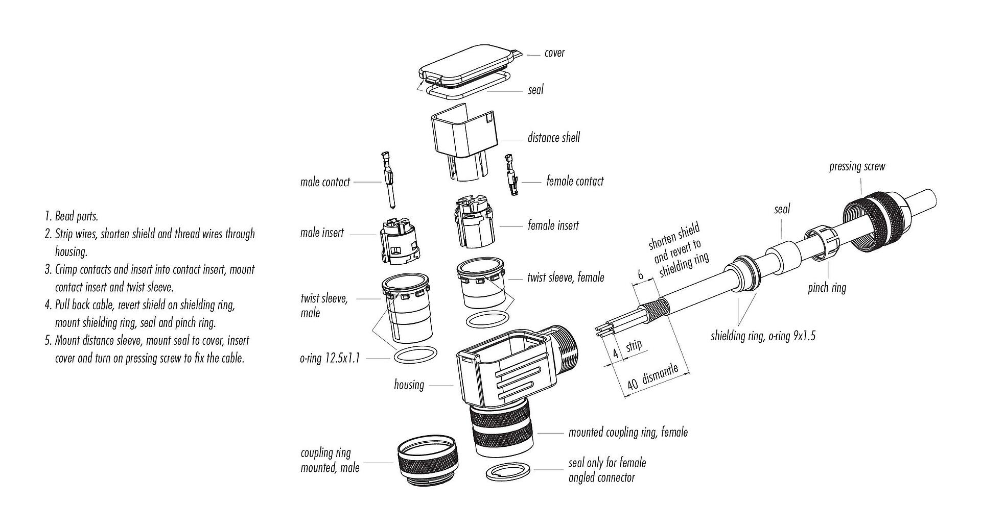 - Aby zabezpieczyć złącze przed niezamierzonym otwarciem, gwint pomiędzy obudową a głowicą złącza należy zabezpieczyć odpowiednim klejem cyjanoakrylowym w przypadku stosowania w obwodach o napięciu niebezpiecznym w dotyku. Nie dotyczy to złączy stosowanych w obwodach SELV i PELV zgodnie z IEC 61140 (EN 61140, VDE 0140-1).