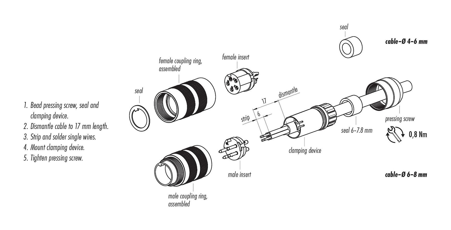 - Aby zabezpieczyć złącze przed niezamierzonym otwarciem, gwint pomiędzy obudową a głowicą złącza należy zabezpieczyć odpowiednim klejem cyjanoakrylowym w przypadku stosowania w obwodach o napięciu niebezpiecznym w dotyku. Nie dotyczy to złączy stosowanych w obwodach SELV i PELV zgodnie z IEC 61140 (EN 61140, VDE 0140-1).