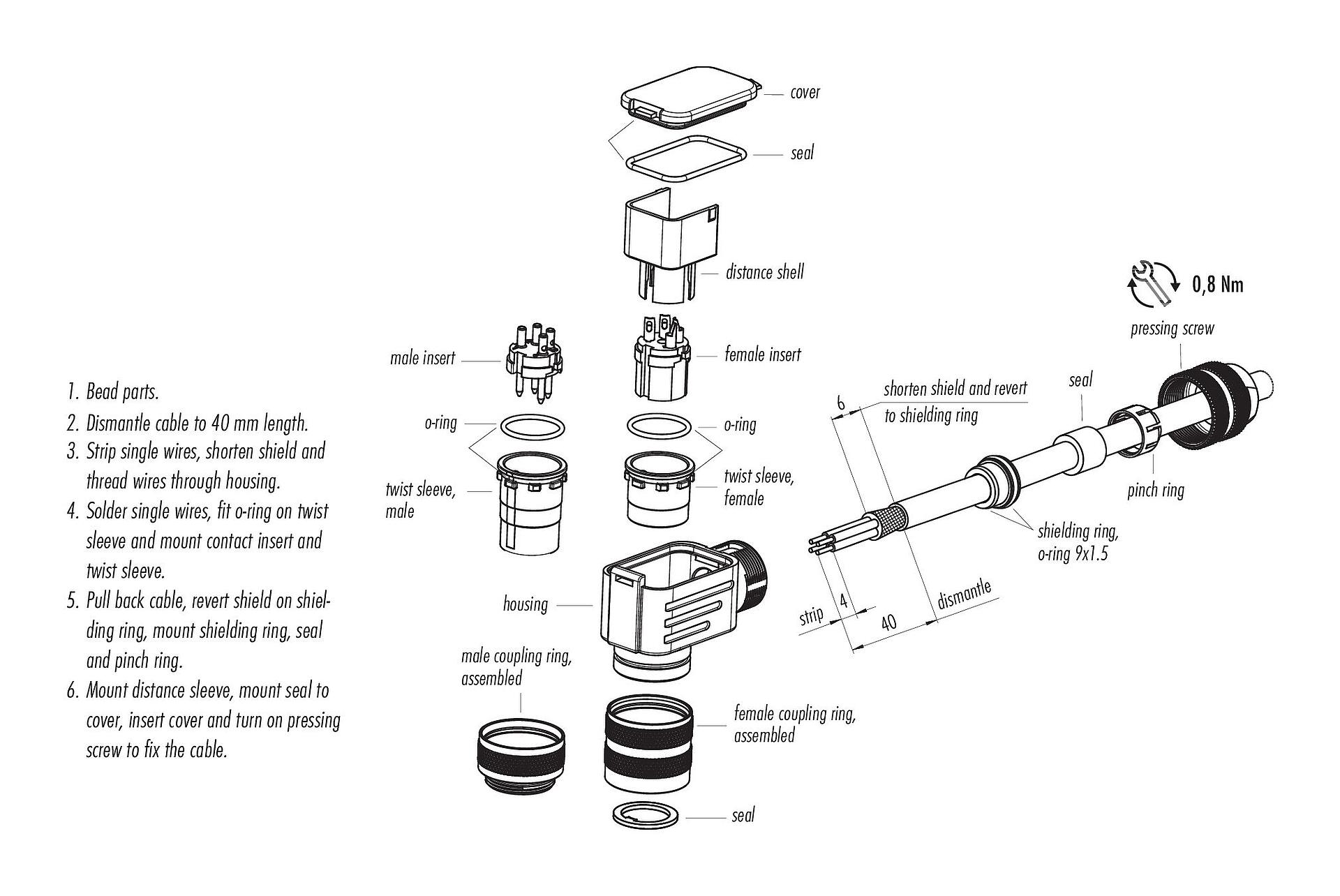 - Aby zabezpieczyć złącze przed niezamierzonym otwarciem, gwint pomiędzy obudową a głowicą złącza należy zabezpieczyć odpowiednim klejem cyjanoakrylowym w przypadku stosowania w obwodach o napięciu niebezpiecznym w dotyku. Nie dotyczy to złączy stosowanych w obwodach SELV i PELV zgodnie z IEC 61140 (EN 61140, VDE 0140-1).