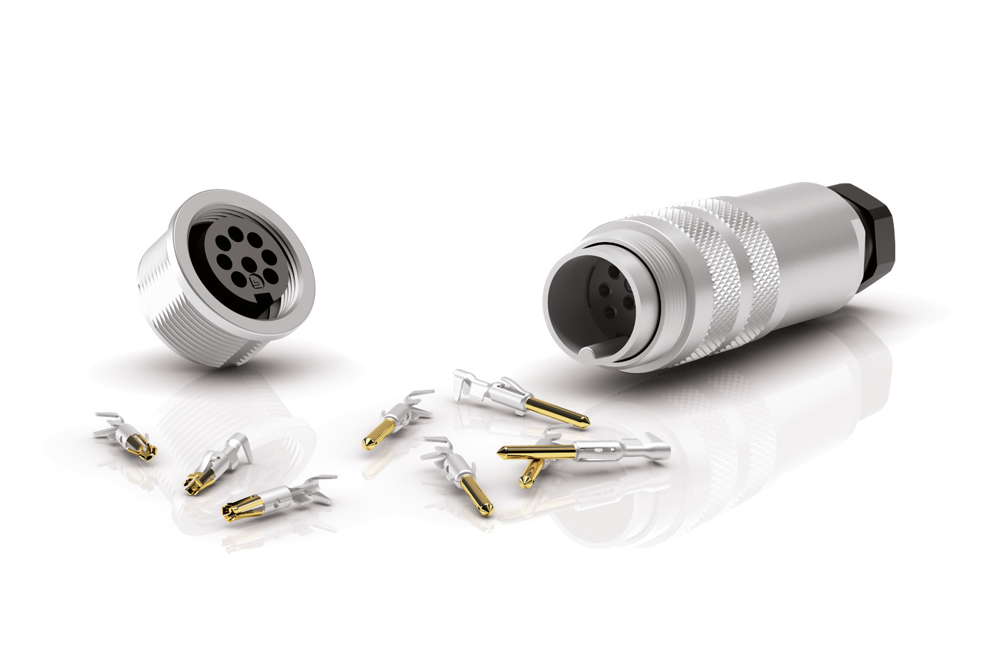 M16 connectors for crimp termination of the binder 423 series are specified for rated voltages from 32 V to 150 V at 5 A or 6 A, depending on the number of pins. 2- to 8-pin versions are available. Depending on the contact surface (silver or gold), they achieve a mechanical lifetime of at least 500 or 1000 mating cycles, respectively. The products are equipped with screw locking and are designed for industrial environments according to protection degree IP67. In addition to crimp, solder and screw clamp versions of the M16 size are also available from binder, as well as wired versions, and overmolded cables.