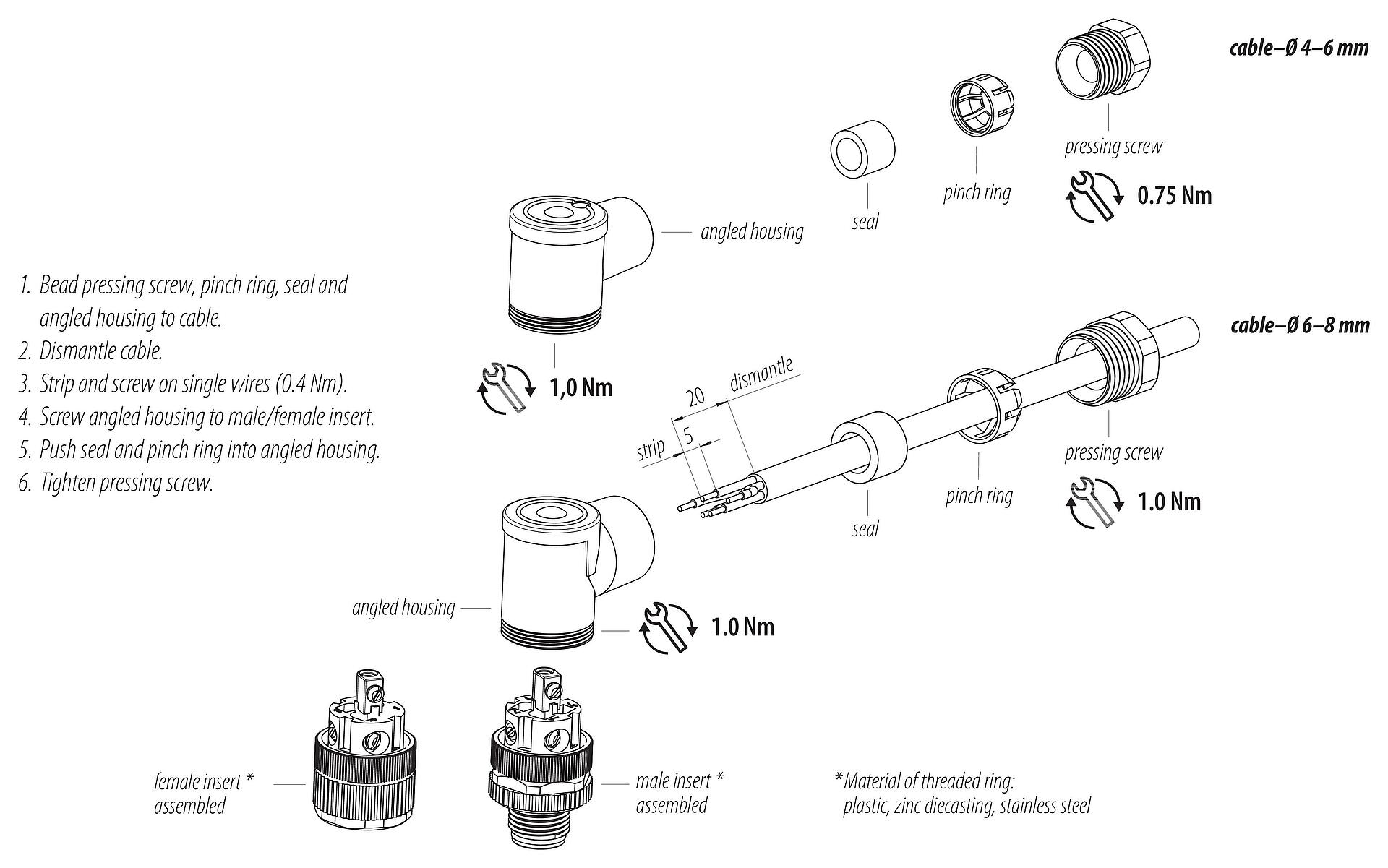 - Para proteger contra abertura não intencional do conector, a rosca entre a carcaça e o cabeçote do conector deve ser fixada com um adesivo adequado de cianoacrilato quando usado em circuitos com tensões perigosas ao toque. Isto não se aplica aos conectores utilizados nos circuitos SELV e PELV de acordo com a norma IEC 61140 (EN 61140, VDE 0140-1).