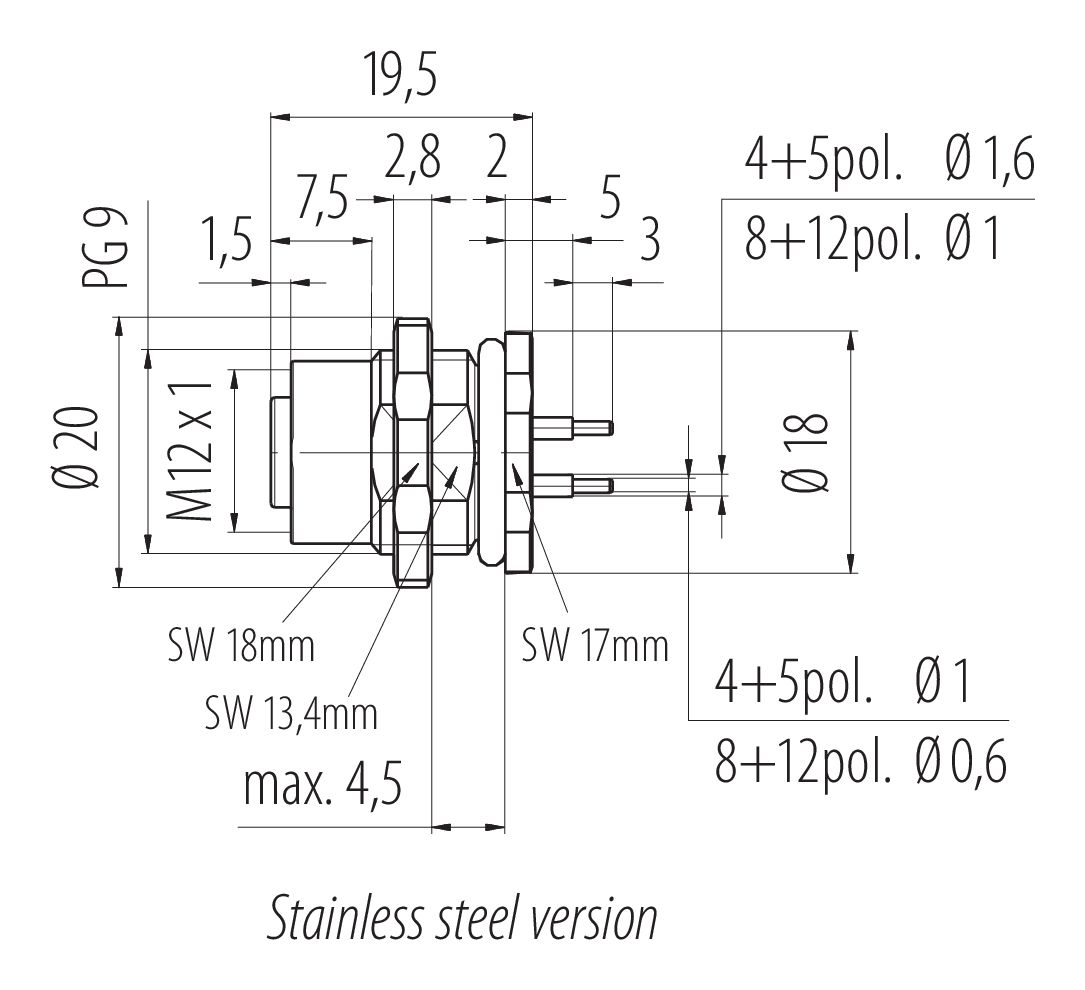 M12 Laippapistorasia, Napojen määrä: 5, suojaamaton, THT, IP68, UL 2238, PG 9, Kiinnitys takaseinään, Ruostumaton teräs
