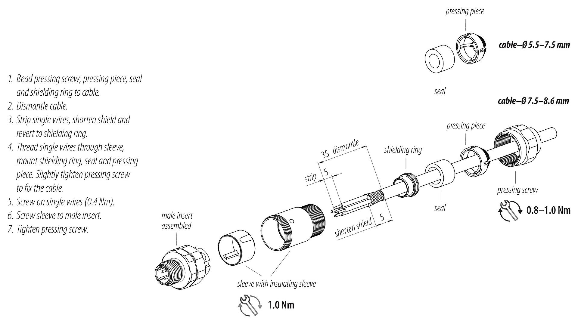 - ケーブルコネクタをデバイスコネクタで固定するには、ネジリングを「手で締め付ける」(約60cNm)。