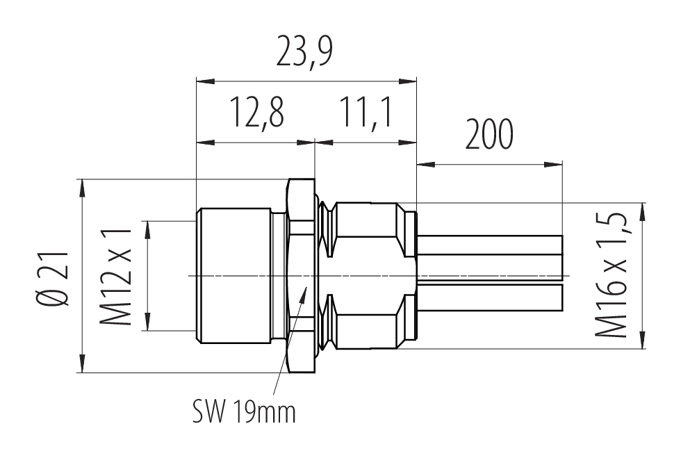 M12 孔头法兰座, 极数: 4+PE, 非屏蔽, 带导线, IP68, M16x1.5, 板前安装, UL 2237正在准备中