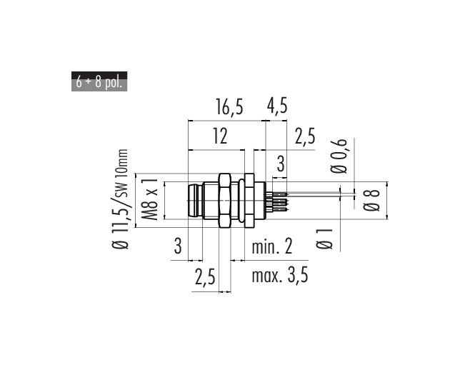 M8 Male panel mount connector, Contacts: 6, unshielded, THT, IP67, UL 2238, M8x1.0, Rear mounting